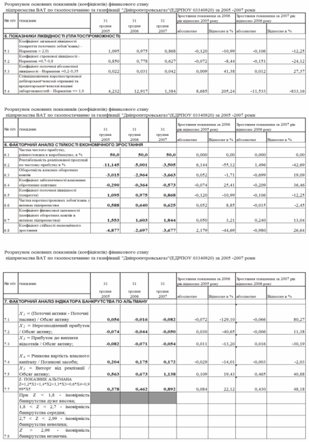 Згідно результатам розрахунку інтегрального показника ризику банкрутства Альтмана за даними балансу ВАТ «Дніпропетровськгаз» у 20052007 роках імовірність банкрутства підприємства ВАТ «Дніпропетровськгаз» є дуже значною, що потребує негайної програми заходів по оздоровленню підприємства.