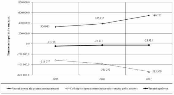 - Прогнозування обсягів реалізації, собівартості та чистого прибутку ВАТ «Дніпропетровськгаз» на період 2008 2010 років на основі кореляційно – регресійної економіко-математичної моделі діяльності ВАТ у 2005 2007 роках (лінійна модель прогнозу) – рис.3.1;