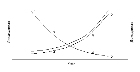 Зависимость от риска и ликвидности (гарантированности выплат) для разных ценных бумаг: 1 - облигации, обеспеченные залогом; 2 - облигации, не обеспеченные залогом; 3 - привилегированные акции; 4 - обыкновенные акции; 5 – опционы
