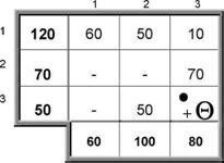Получим новую текущую таблицу, в которую не входят заполненные и запрещенные клетки. Если таблица не пуста, переходим к шагу 1. (При исчерпании таблицы - конец).