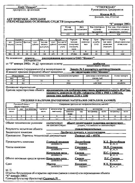 Акт приемки-передачи (перемещения) основных средств применяется для зачисления в состав основных средств отдельных объектов; для оформления ввода их в эксплуатацию, за исключением тех случаев, когда ввод в действие должен быть, в соответствии с существующим законодательством, оформлен в особом порядке; для оформления внутреннего перемещения основных средств из одного цеха (отдела, участка) в другой; для оформления передачи основных средств со склада (из запаса) в эксплуатацию, а также для исключения из состава основных средств при передаче другому субъекту (вклады в уставный капитал, реализация, дарение).