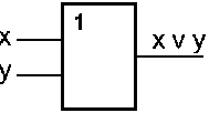 Умовна позначка на структурних схемах схеми АБО з двома входами представлене на мал.5.2 Знак "1" на схемі - від застарілого позначення диз'юнкції як ">=1" (тобто значення диз'юнкції дорівнює одиниці, якщо сума значень операндів більше або дорівнює 1). Зв'язок між виходом z цієї схеми і входами x і y описується співвідношенням: z = x v y (читається як "x або y").