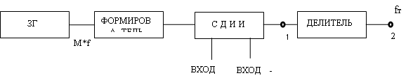 Задающий генератор вырабатывает меандр с частотой Fзг = m * f т, далее меандр поступает формирователь, формирующий короткие импульсы. Эти импульсы поступают на схему добавления и исключения единиц, которая работает следующим образом: если в момент времени между входными импульсами приходит импульс на вход +1, то в последовательность добавляется один импульс между входными; если в момент времени между входными импульсами приходит импульс на вход - 1, то из исходной последовательности исключается один импульс. Если ни на один из входов сигнал не подан, то исходная последовательность проходит на выход без изменений. На выходе делителя, выполненного на базе счетчика, будет меандр частоты, зависящей от количества добавленных или удаленных единиц в единицу времени и дискретностью, зависящей от коэффициента деления делителя.