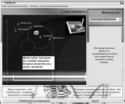 Здесь для хранения названий маршрутов используется элемент управления Combo_Box; для отображения данных по автобусам – Label и Text_Box; для отображения самого маршрута и движения по нему автобусов – Picture_Box; для самих автобусов, остановок.